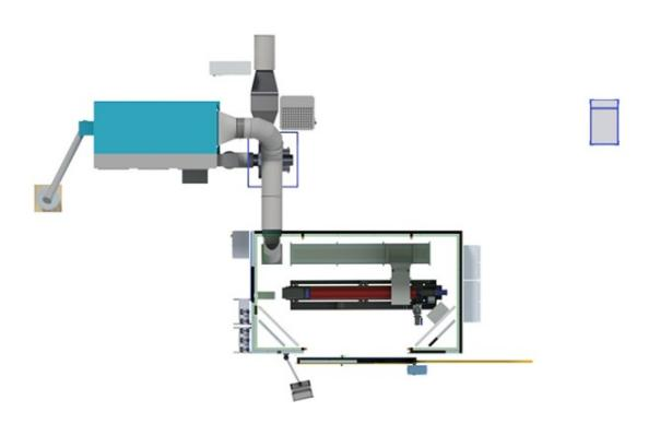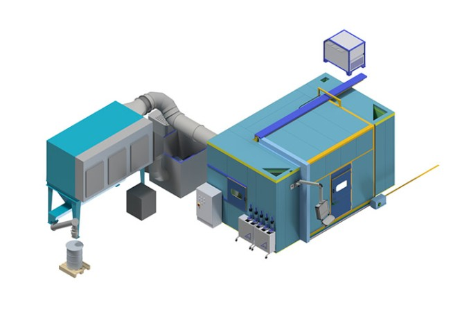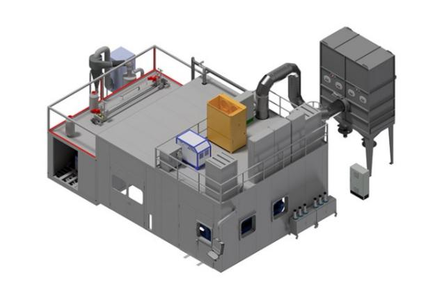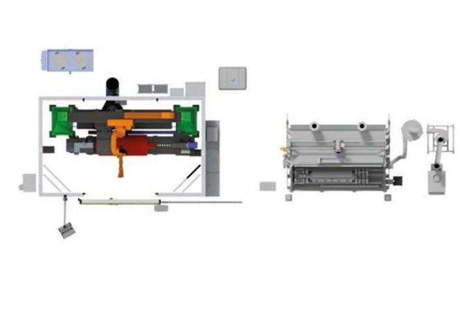 该涂层中心采用等离子喷涂与超音速火焰喷涂工艺,专用于网纹辊的涂层制备。升降门采用倾斜式设计,使得两套搬运系统可交替展开,并通过车间行车更方便人机协同更换部件。两套辊筒搬运系统后方装有一套机器人移动系统,从而可在两个喷涂房内完成涂层工艺。